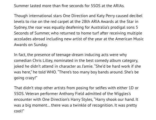Back on the carpet and in the press room for the "Grammys of Australia," I didn't have an Air Supply moment like last year, but Tim Farriss did remember me from the Rock Star: INXS days in L.A, so that was a plus! And I got to be in the same room as Neil Finn and Paul Kelly. I worked the carpet with the incomparable Alicia Neil, who guided the text and caps of the main magazine feature while I did the initial write-up for Who.com, which you can read if you keep scrolling right. You can also see some bonus pics of 5SOS!